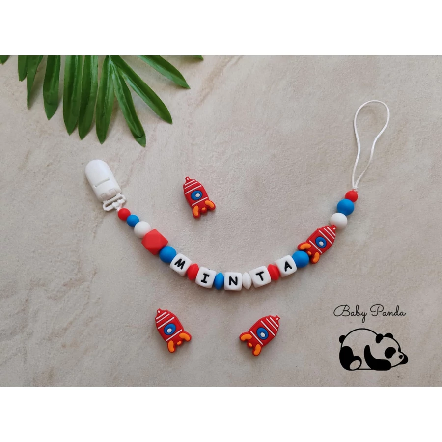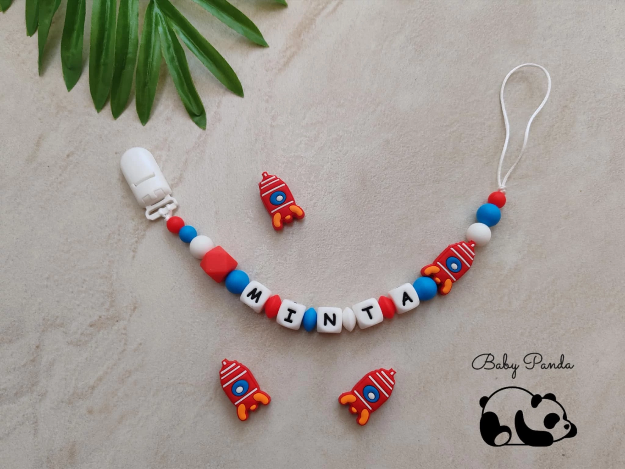 A rakétás cumilánc egyedi névvel igazán különleges ajándék születésre, keresztelőre vagy babalátogatóba. A játékos design és a neves cumilánc funkcionalitása egyszerre biztosítja a cumi védelmét, miközben stílusos és trendi kiegészítőként is helyt áll. A cumilánc kisfiúknak témájú darabjaink között ez az egyik legnépszerűbb, hiszen a rakéta a felfedezés, bátorság és kíváncsiság jelképe.