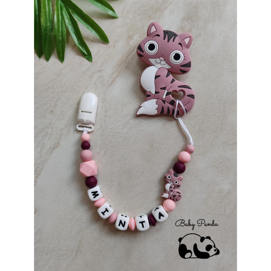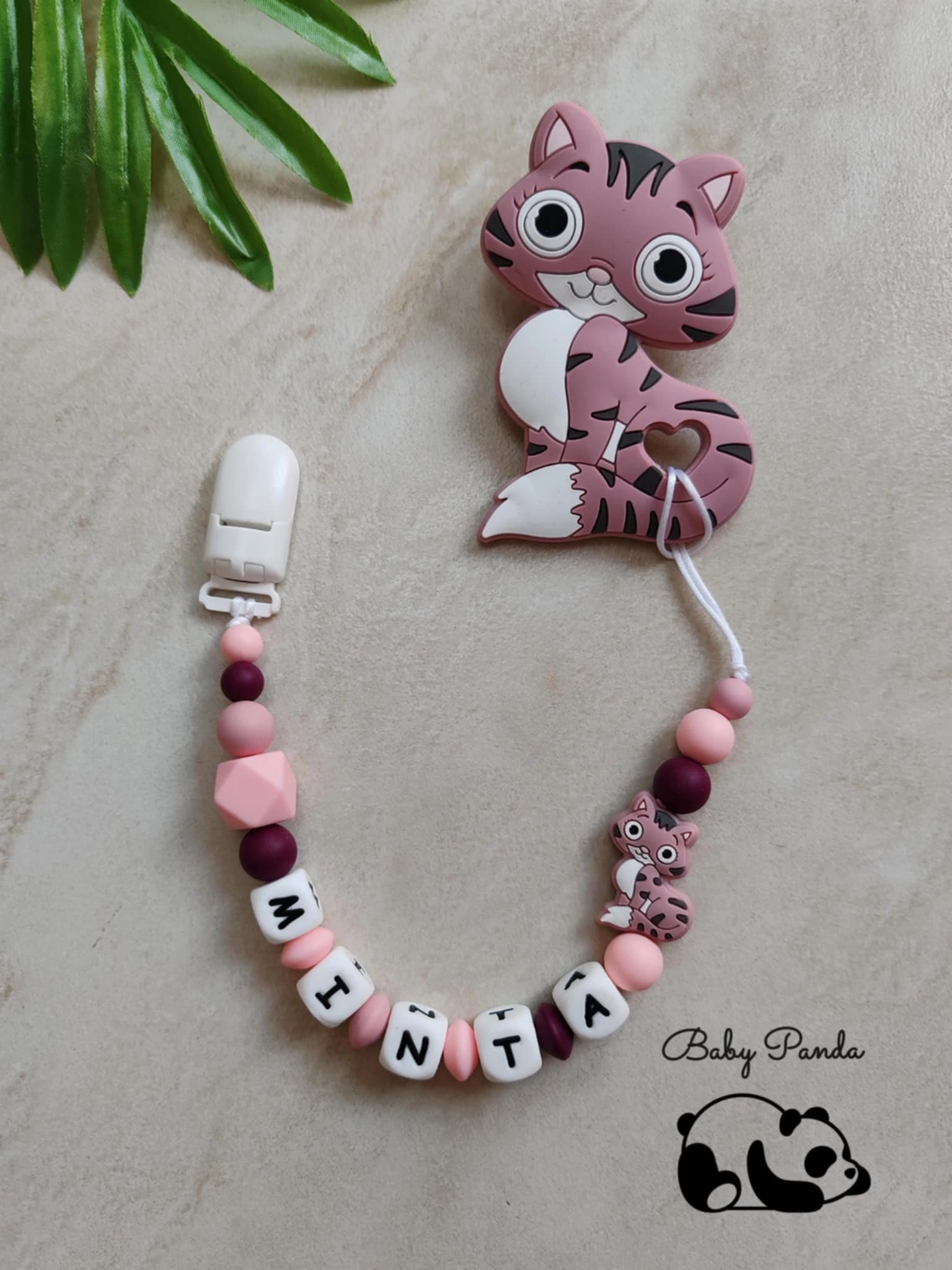 Cicás névre szóló rágcsalánc kisbabáknak – bájos, praktikus és személyes ajándék. Tökéletesen kombinálható egy vidám Rágóka kiegészítővel vagy egy színben illő Cumilánccal.