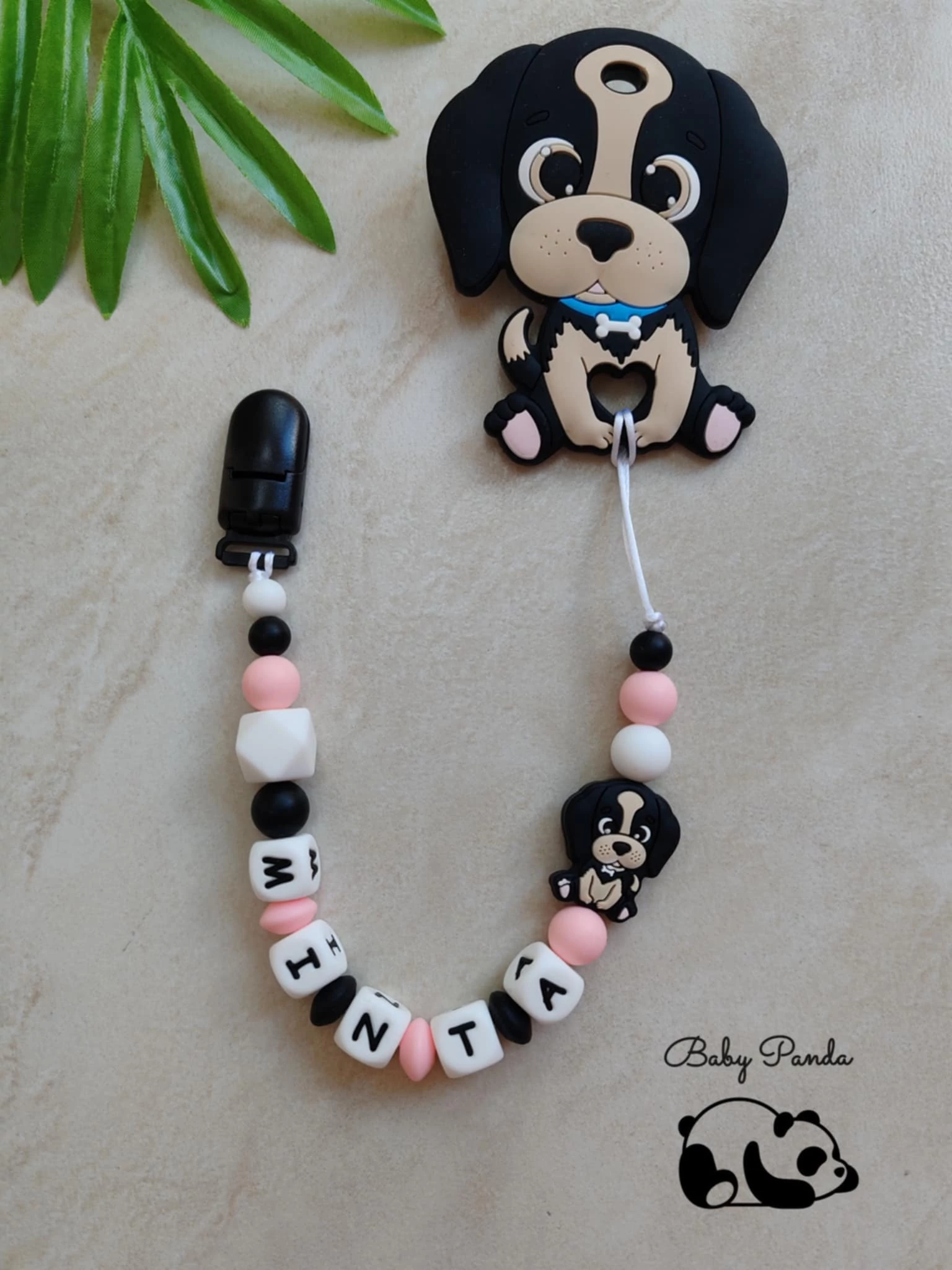 A névre szóló rágcsalánc – Kutyus – fekete-rózsaszín egy igazán figyelemfelkeltő és személyes ajándék, amely tökéletes választás lehet babaváróra, keresztelőre vagy akár a mindennapokra. Ez a stílusos, egyedi rágcsalánc névvel nemcsak praktikus kellék a fogzás időszakában, hanem érzelmi értékkel is bír – egy kisbaba első kedvenc tárgyai közé kerülhet.