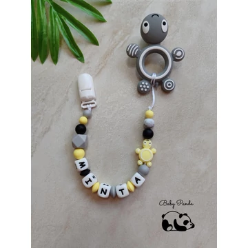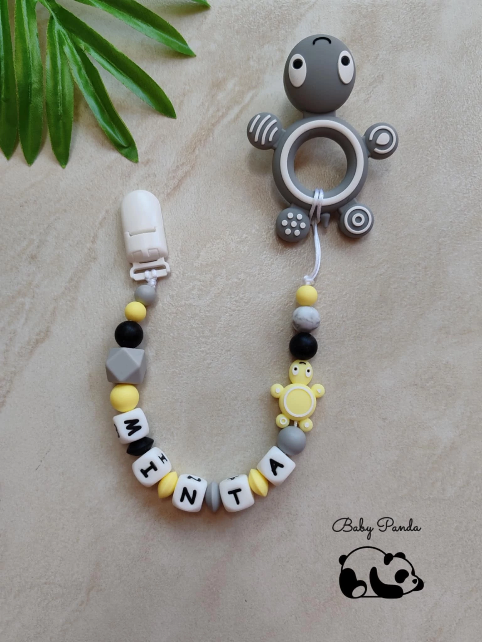Egyedi, névre szóló rágcsalánc teknős mintával, szürke árnyalatban, amely praktikus és stílusos baba rágcsalánc a fogzás időszakára. Bababarát, biztonságos anyagból készült, strapabíró és könnyen tisztítható. Különleges ajándék, jól párosítható a mam cumik vagy az emlékőrző dobozok kategóriáink termékeivel.